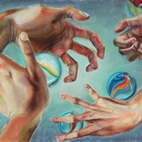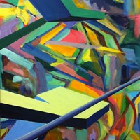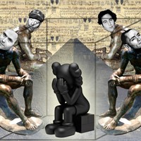 Acrylic paint, denim, genuine wooden piano keys, and sheet music on paper