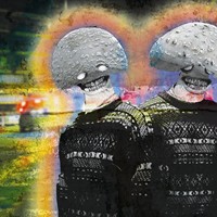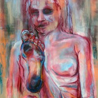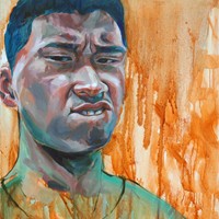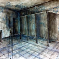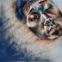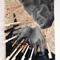 Acrylic paint, denim, genuine wooden piano keys, and sheet music on paper